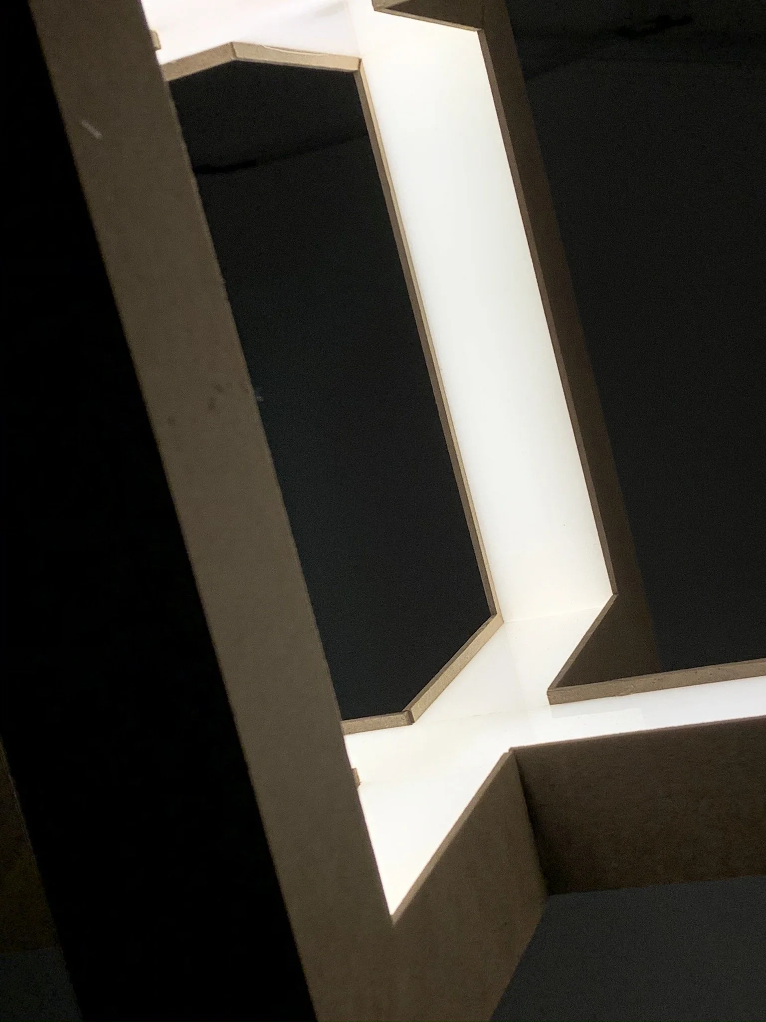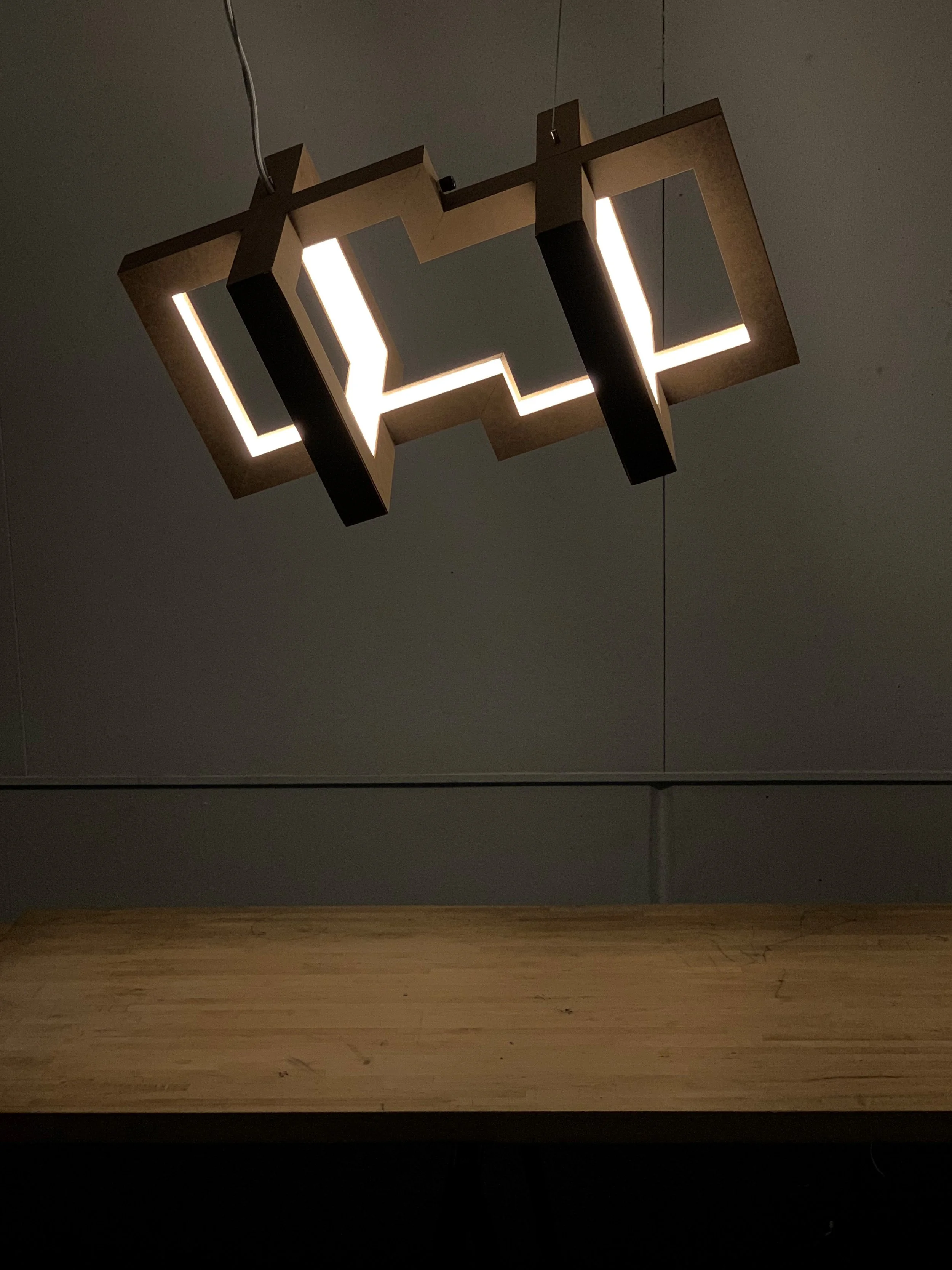 The luminary pictured was designed to illuminate a residential dining room table that seats four to six people. The form is based off of the idea of two cube shapes that are not perfectly aligned.